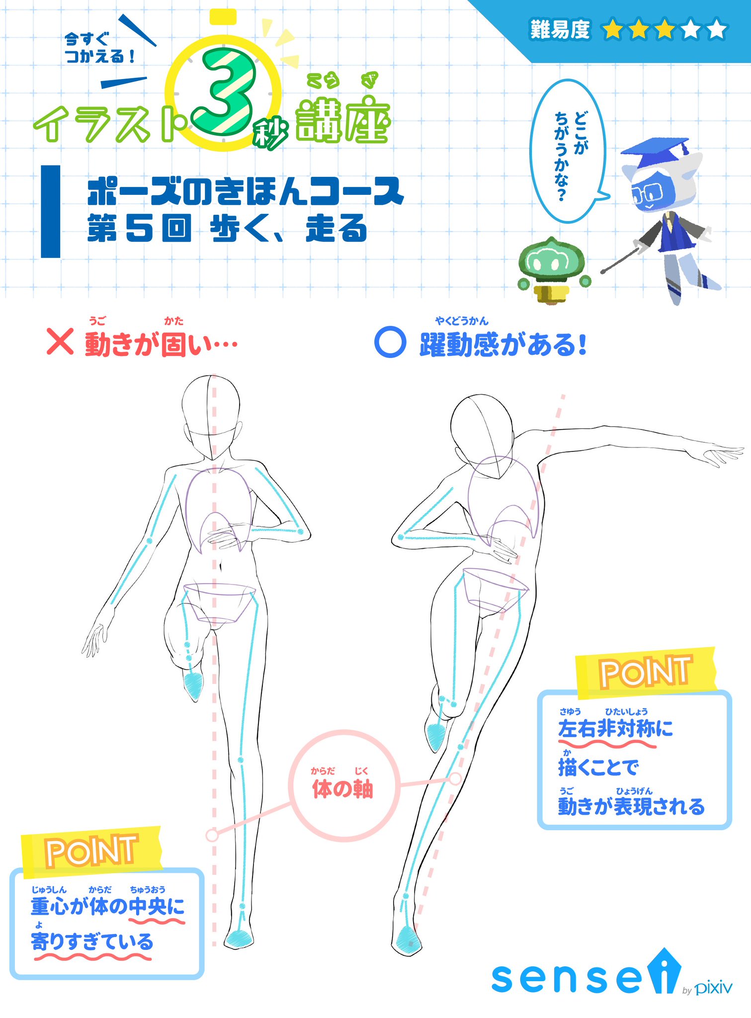 Pixiv描き方 Sensei 走るポーズを正面から描くと動きが固くなりがちです 体の軸と地面との角度に気をつけましょう イラスト3秒講座 T Co Vq8oiweykv